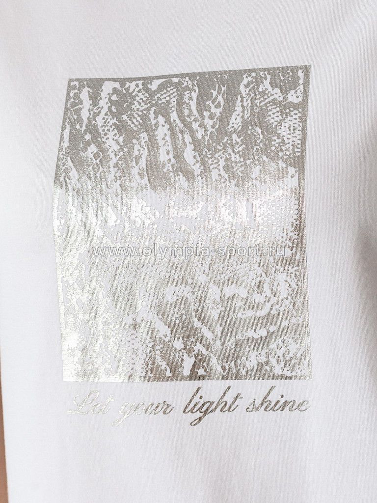 Перевод надписи: let your light shine — сияй. Футболка выполнена из премиального хлопка с эластаном. Эффектный фактурный принт нанесен фольгой с устойчивым покрытием, он станет дополнением не только в повседневных сочетаниях, но и отлично подойдет к вечерним образам.Изделие отлично держит форму, почти не мнется и комфортно сидит по фигуре. Отдельным украшением служит металлический логотип бренда на рукаве изделия.